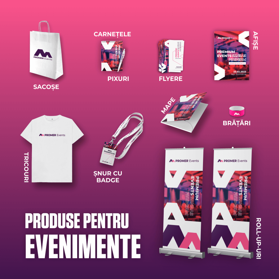 Te putem ajuta să îți realizezi toate materialele de care ai nevoie în cadrul evenimentului. Astfel, îți va fi mai ușor să te ocupi de restul elementelor: speakeri, sală, protocol etc.